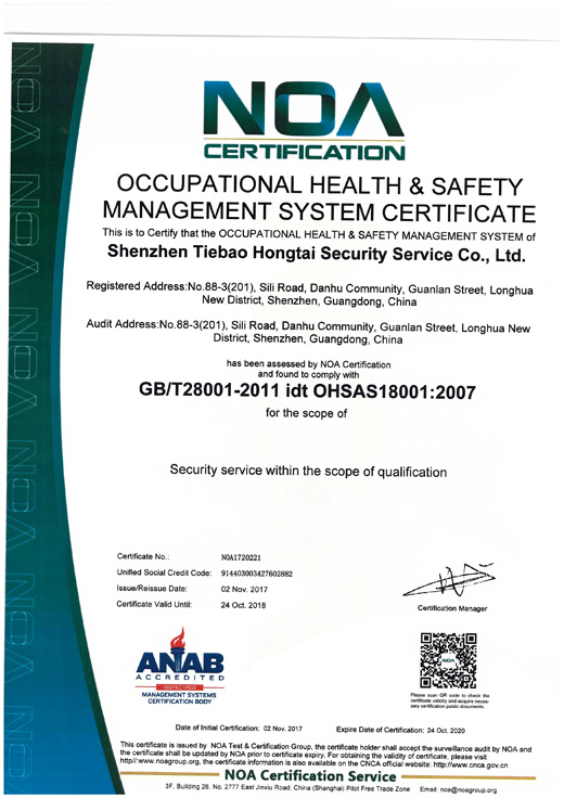 熱烈祝賀深圳市鐵保宏泰保安服務(wù)有限公司榮獲職業(yè)健康安全管理體系認(rèn)證證書...